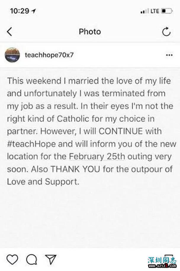 据了解,莫尔菲2月初与交往2年的同性伴侣成婚,并于当地时间2月8日上班时遭校方解雇。莫尔菲受访时表示,他们因为我的伴侣选择,而不认为我是合格的天主教徒。据悉,莫尔菲已于在学校任教7年,备受爱戴,有20名家长9日在校园集会,要求校长解释。有家长不满校方当莫尔菲是罪犯,又认为她教得好,校方应为学生着想。